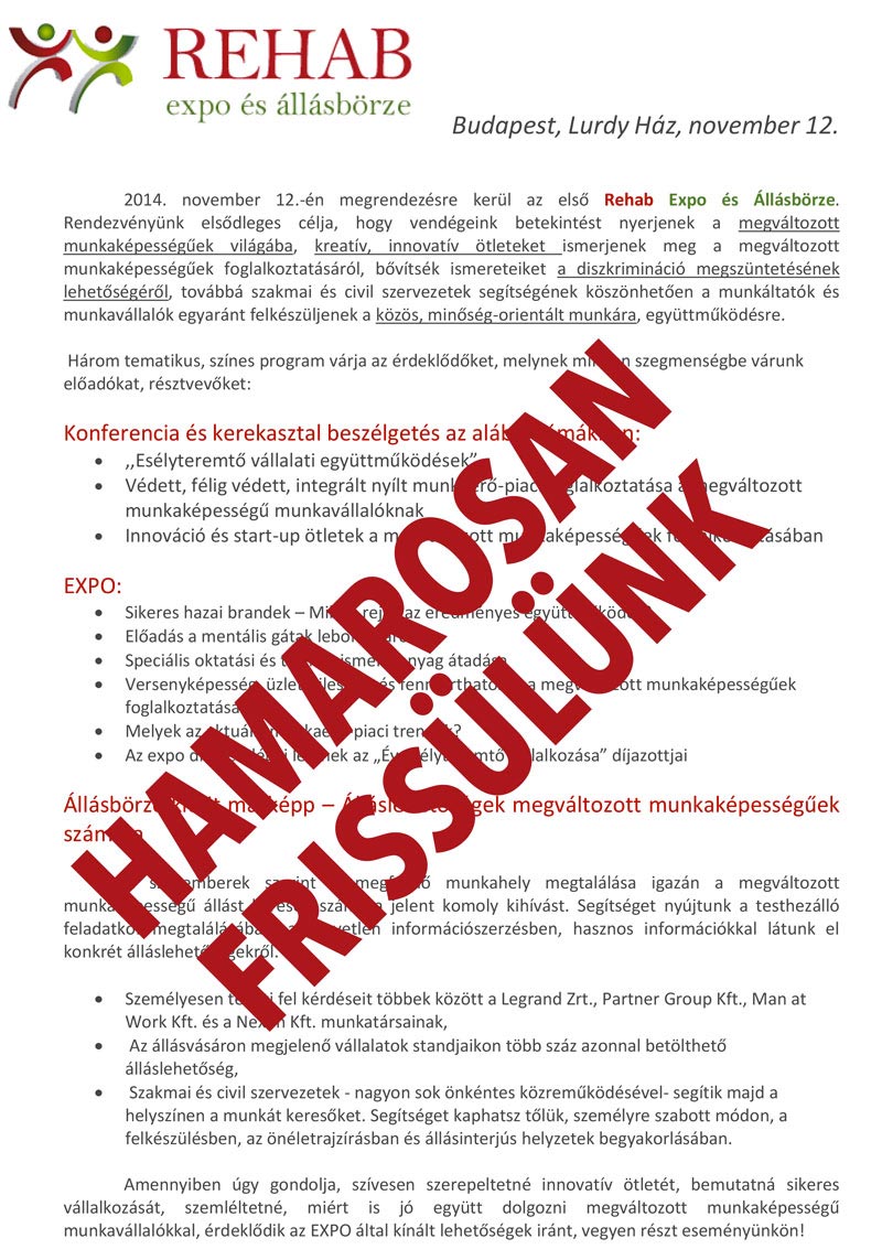 A 2014-ben megszervezett rehabilitációs expo és állásbörze mintájára, 2022 tavaszán ismételten megrendezésre kerül. További tartalmak hamarosan érkeznek.